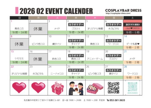 CALENDARいつもコスプレバーDRESSをご利用いただき、誠にありがとうございます。 2026年2月28日(土)までの営業日程等を下記掲載のカレンダー通りとさせて頂きます。※状況により変更が生じる場合がございます。また、予告なくスタ...