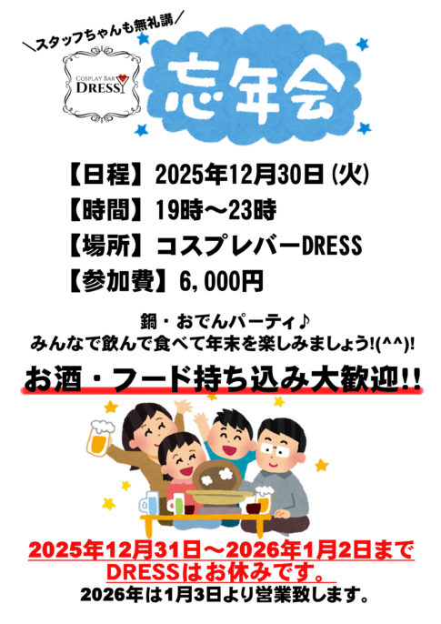 DRESS INFOいつもコスプレバーをご利用頂き誠にありがとうございます。 今年もありがとう!忘年会! 【日程】2025年12月30日(火)【時間】19時~23時【参加費】6,000円 今年もDRESS忘年会を開催します💖スタッフ総出の無...