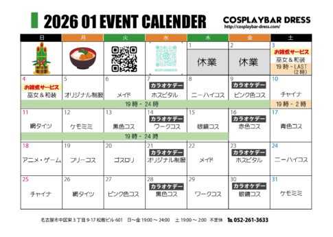 いつもコスプレバーDRESSをご利用いただき、誠にありがとうございます。 2026年1月31日(土)までの営業日程等を下記掲載のカレンダー通りとさせて頂きます。※状況により変更が生じる場合がございます。また、予告なくスタ...