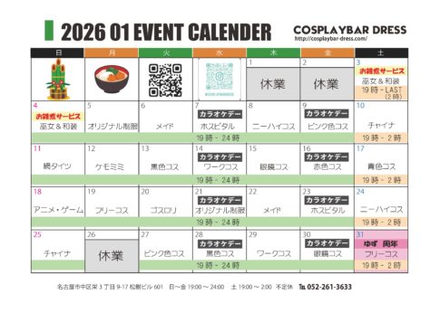 CALENDARいつもコスプレバーDRESSをご利用いただき、誠にありがとうございます。 2026年1月4日(日)までの営業日程等を下記掲載のカレンダー通りとさせて頂きます。※状況により変更が生じる場合がございます。また、予告なくスタッ...