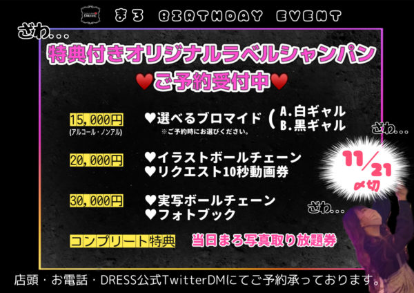 ¥15,000(ノンアルコール/アルコール) ➡ラベル/A.白ギャルブロマイドor B.黒ギャルブロマイド ¥20,000(アルコール) ➡ラベル/イラストボールチェーン/貴方の携帯で10秒リクエスト動画券 ¥30,000(アルコール) ➡ラベル/実写ボールチェーン/フォトブック 💓3種コンプリート特典💓 ➡︎当日まろ写真撮り放題券 |
